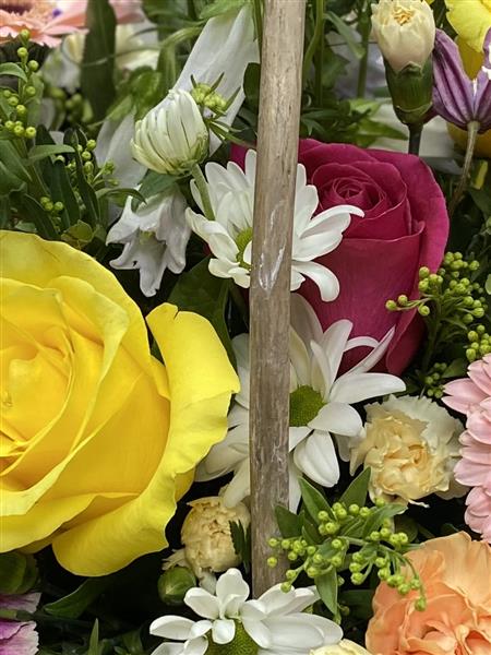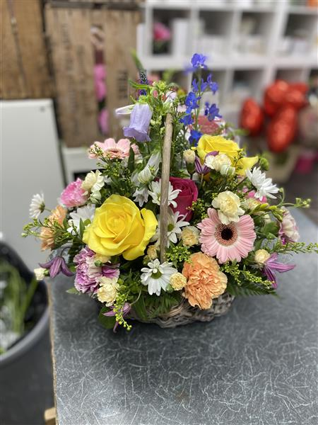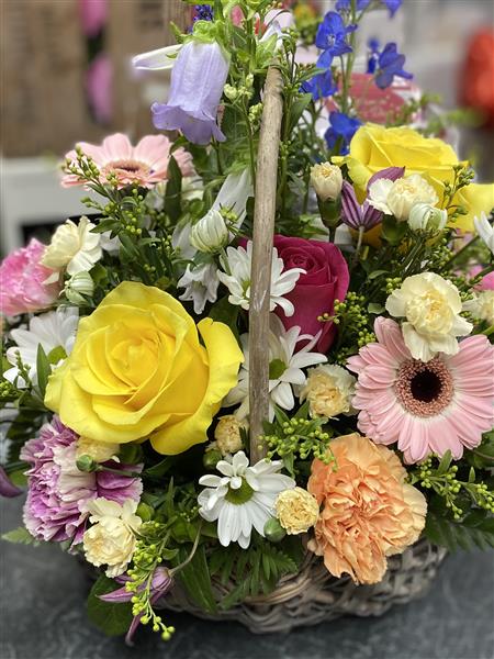 Stunning mix of florals in a wicker basket , flowers may vary due to availability